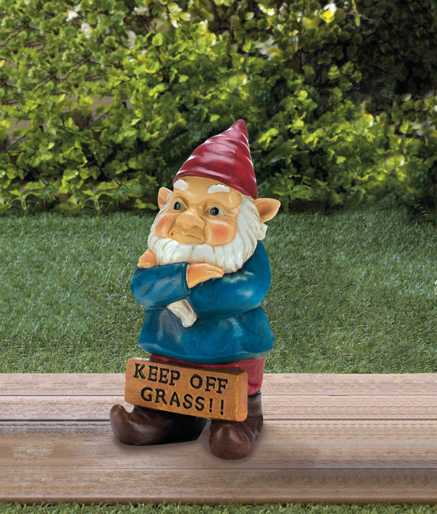 • Don't cross this gnome! He's got a grumpy look and a sign that reads 'Keep Off Grass!!' which makes him a great addition to your high-traffic outdoor areas.